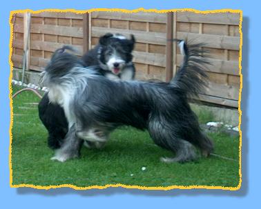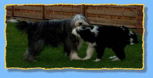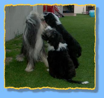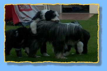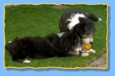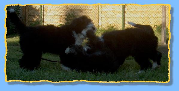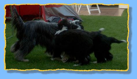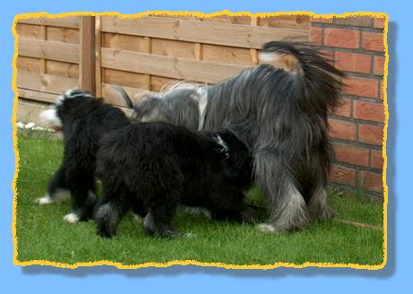 Die Welpen sind 14 Wochen alt und beanspruchen viel Zeit und Zuwendung, da sie sehr neugierig sind und einen großen Bewegungsdrang haben. Sie haben inzwischen problemlos die zweite Impfung hinter sich gebracht und freuen sich, daß sie nun unsere Hunde auch einmal in den Wald begleiten können.