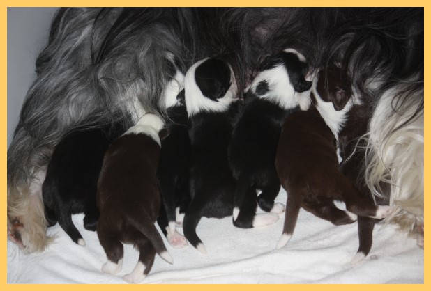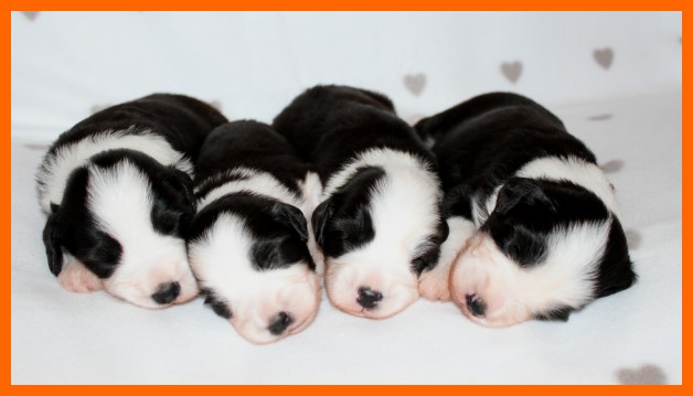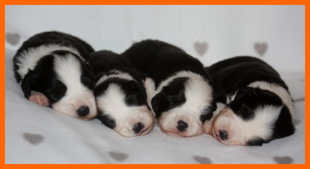 Noch einmal die 2 schwarz-weißen Rüden 1 und 5 und dann mit ihren schwarz-weißen Schwestern 2 und 3