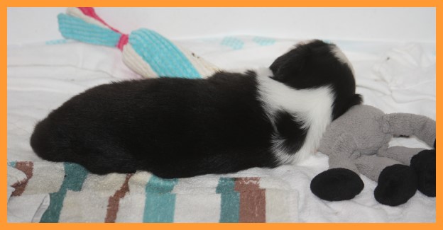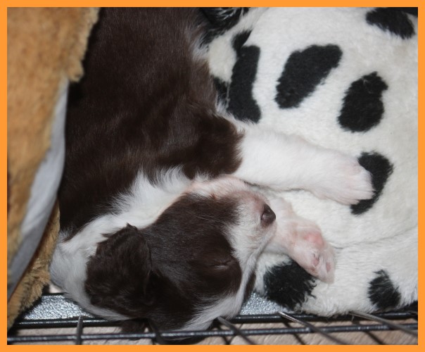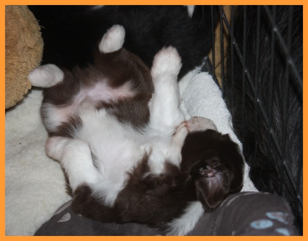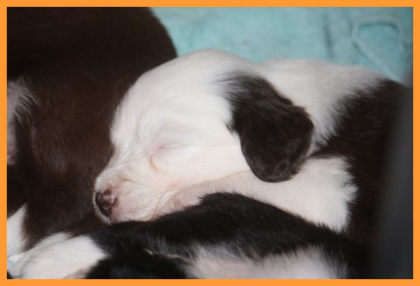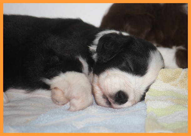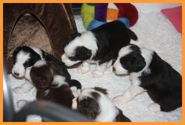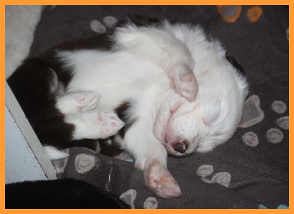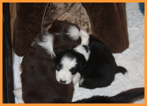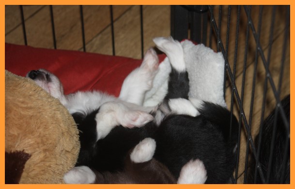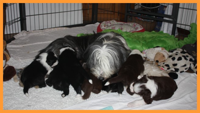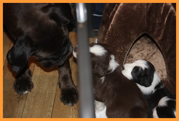 Heute sind die Welpen 4 Wochen und 3 Tage. Inzwischen sind die Spielphasen länger und wilder geworden. Die ersten Besucher waren auch schon da und haben sich mit ihren zukünftigen Familienmitgliedern ordentlich beschnuppert. ;o)