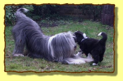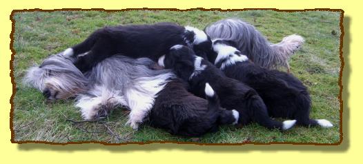 Nun sind die Welpen schon 6 Wochen. Leider haben wir in der letzten Woche nicht immer schönes Wetter gehabt, sodaß die Welpen nicht so oft und nur kurze Zeit draußen spielen konnten. Sie sind trotzdem zufrieden und ausgeglichen und wir super stolz auf diesen tollen Wurf.